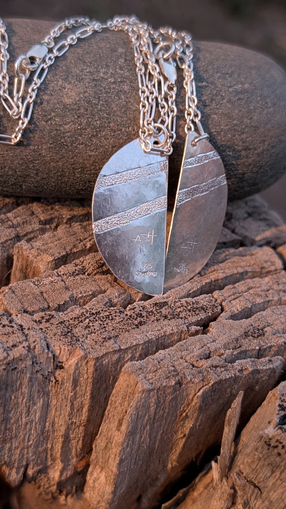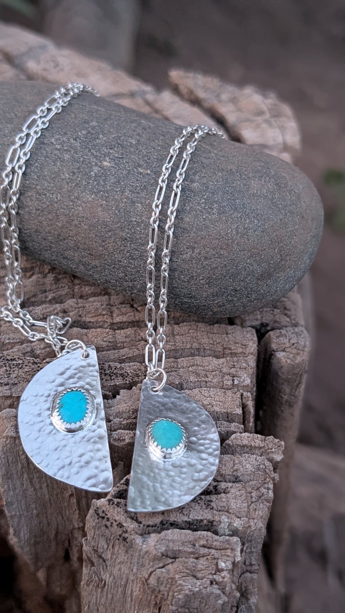 | Inspired by the cherished friendship necklaces of childhood, this set of two necklaces is designed to be shared with someone special. Each necklace features a delicate rose-cut oval turquoise stone on the front, while the backs reveal a unique design that perfectly aligns when worn side by side. A meaningful symbol of connection, friendship, and a lasting bond. |