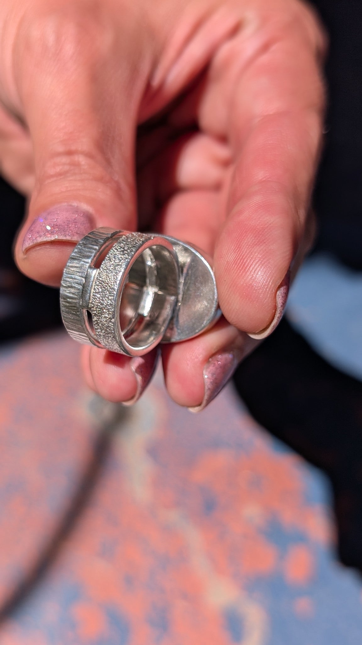 | Bold and unforgettable, this statement ring features snakeskin variscite from Nevada which is prized for its striking unique color and natural patterns. The double band design showcases two distinct textures side by side, each unique yet harmoniously paired to create a powerful and original look. Perfect for those who love jewelry with character and edge. |